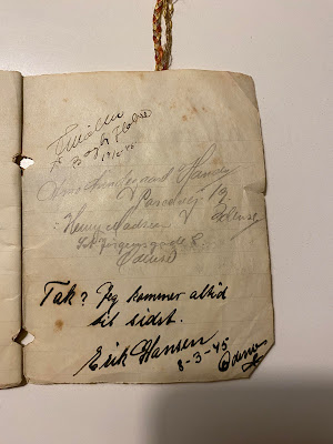 Grethe Eline Hansen fik under sit ophold i Frøslevlejren lavet en autografbog, hvori hun samlede navne og hilsener fra medindsatte. Bogen foreligger her affotograferet i sin helhed.